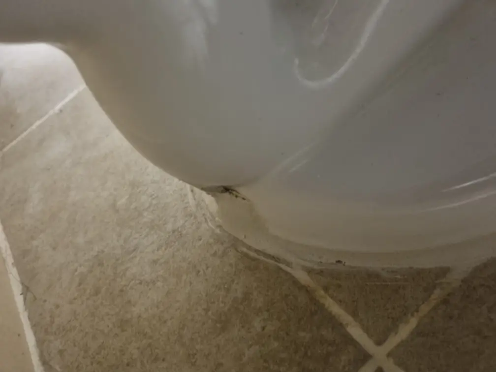 변기 하단 둘레를 살펴보니 기존 백시멘트가 여러 곳에서 갈라지고 떨어져 나가 틈이 벌어져 있었습니다. 그 틈으로 물기가 스며들어 곰팡이까지 생긴 상태였습니다. 변기를 살짝 들어보니 고정 볼트도 헐거워져 있었습니다.